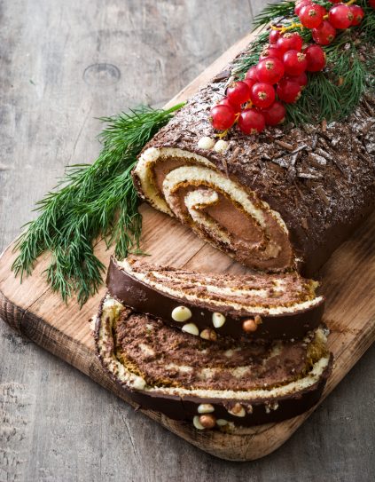 La bûche au chocolat est un dessert de Noël traditionnel très populaire en France. La bûche de Noël est un gâteau en forme de bûche qui est généralement garni de crème glacée ou de crème fouettée et recouvert de chocolat.